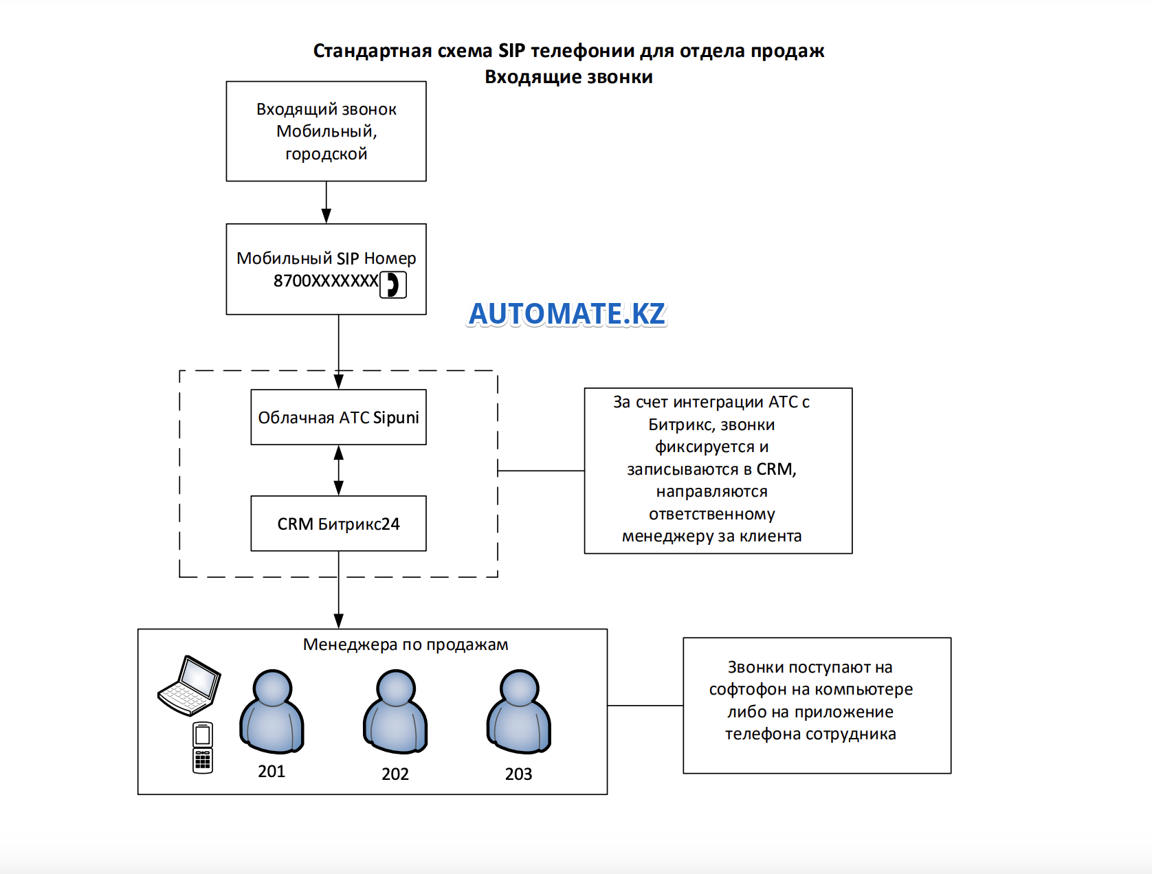 Простая схема поступления звонка через облачную АТС с применением CRM системы может выглядеть следующим образом: